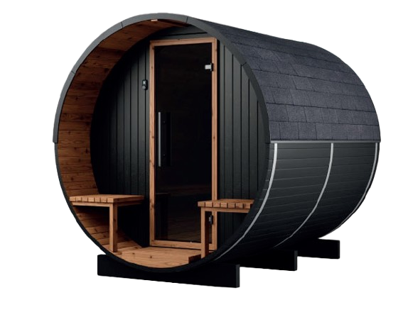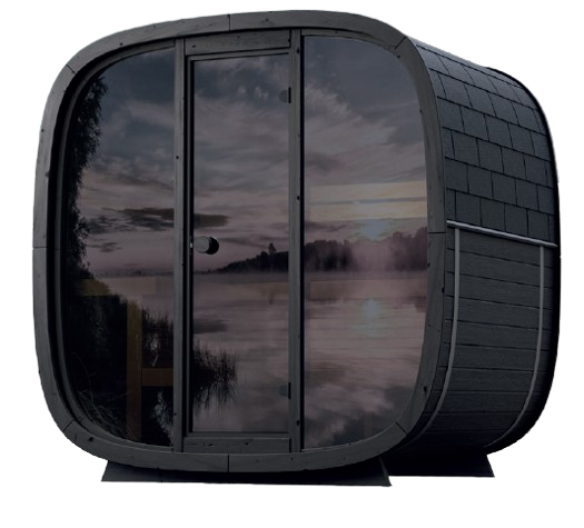 Sauna disponível em duas versões distintas, formato cubo e formato barril.