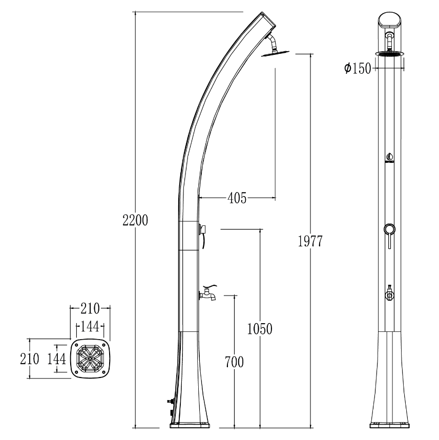 Design e componentes exclusivos para este chuveiro solar cinza, fabricado em PEHD, polietileno de alta densidade molecular não tóxico, muito resistente aos agentes atmosféricos, raios UV e agentes químicos. Cabeça de chuveiro grande com bicos anticalcários especialmente concebidos.