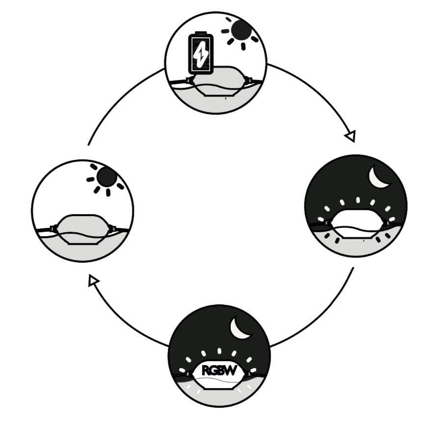 Botões de transição de cor, mudança de cor e LIGAR/DESLIGAR na base do produto.