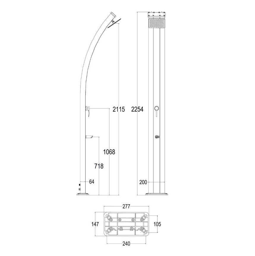 Altura 225,4 cm, dimensões da base 14,7×27,7 cm, cabeça de chuveiro quadrada cromada em aço inoxidável 20×20 cm.