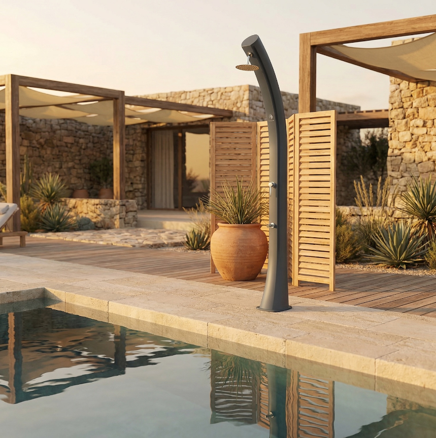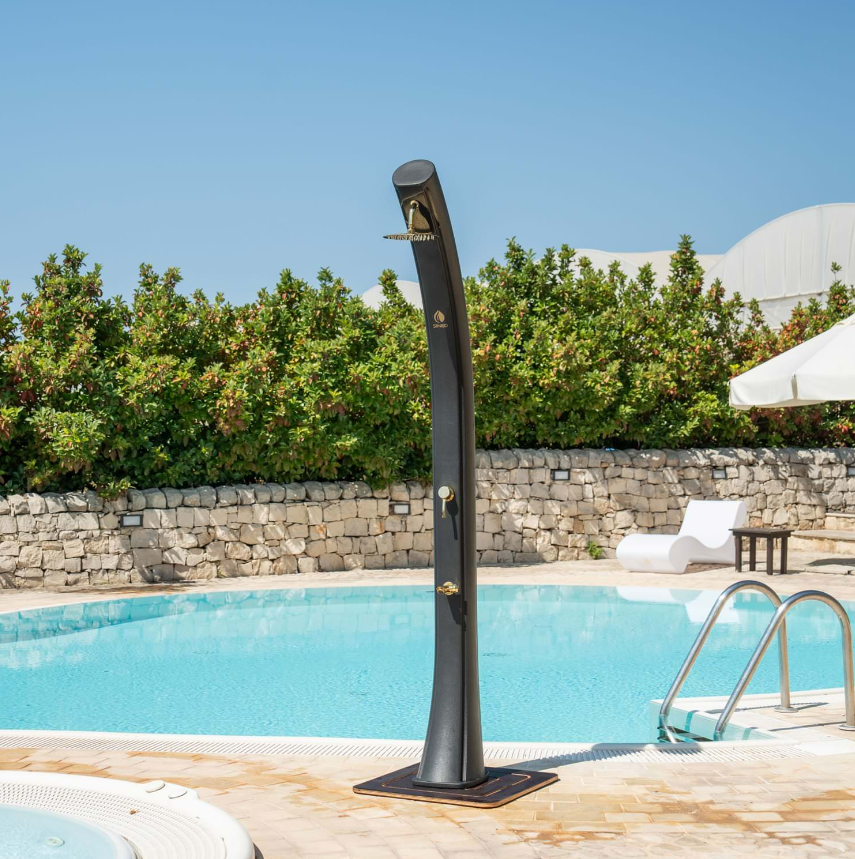 Chuveiro solar preto com acessórios dourados. Elegante chuveiro solar preto, design exclusivo e acessórios em preto metalizado. Fabricado em PEHD, polietileno de alta densidade molecular não tóxico, muito resistente às intempéries, aos raios UV e aos produtos químicos. Inclui tampa resistente e filtro anticalcário.