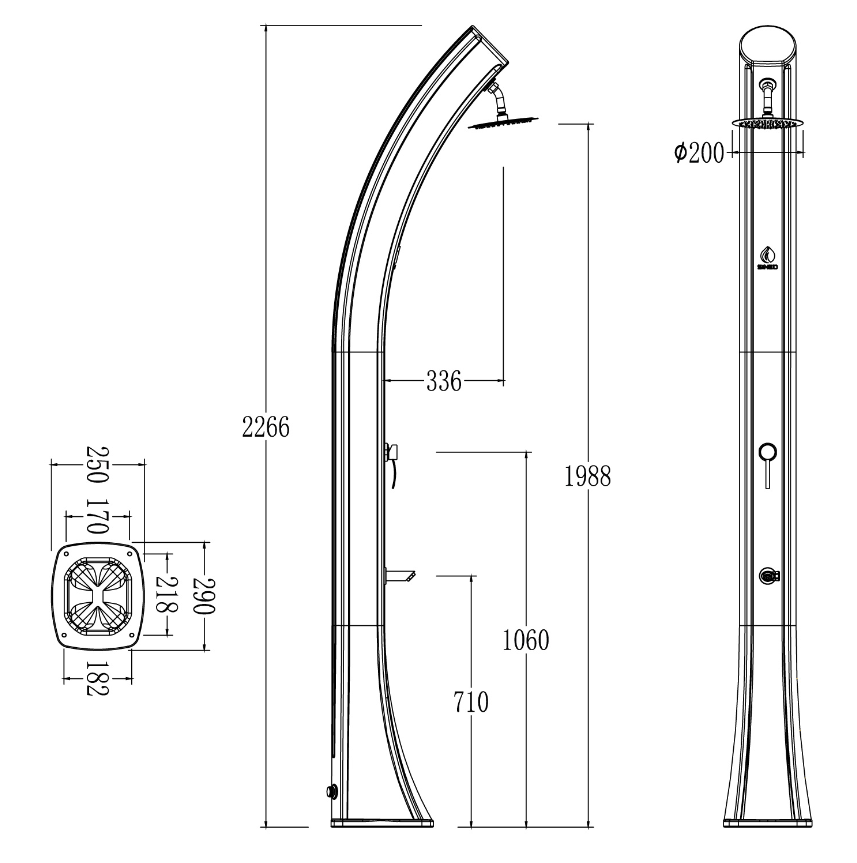 Tecnologia patenteada que permite aquecer a quantidade máxima de água, reduzindo o tempo necessário para aquecer a água no depósito. Isto permite a exploração total da água aquecida pelo sol no chuveiro muito mais rapidamente, em comparação com os tradicionais «chuveiros solares», e fornecer água quente durante o dobro do tempo. Chuveiro solar também concebido para uso profissional com grandes cargas de trabalho para praias, spas e piscinas abertas ao público.