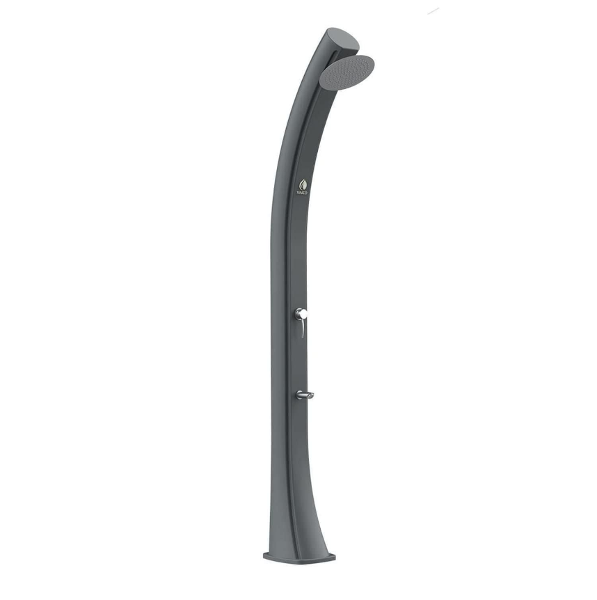 Chuveiro solar curvo Sined Sole Xxl em polietileno HD com torneira e lavadores de pés Tanque preto 40 l Cabeça de chuveiro redonda Torneira para lavagem dos pés Acessórios metálicos Cor dourada