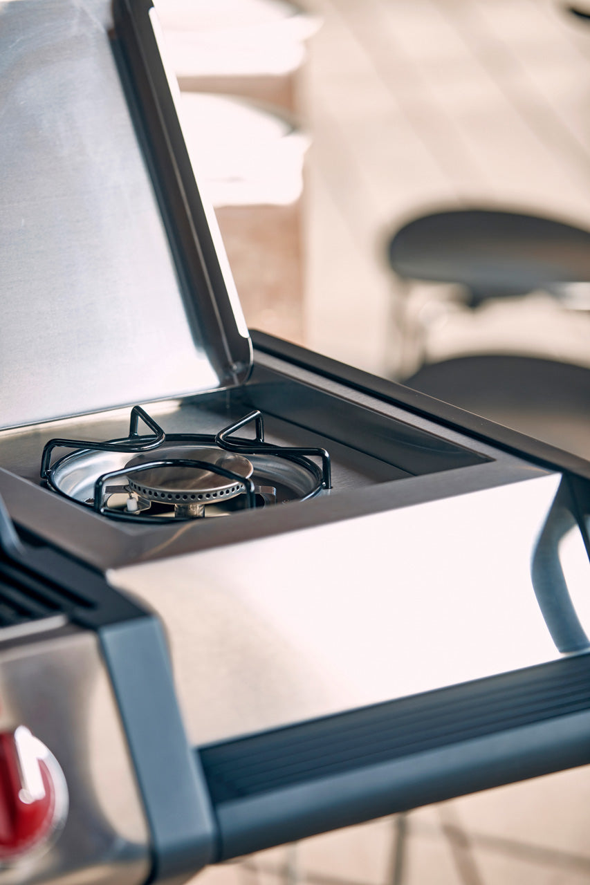 Fogão lateral (2,9 kW): para preparar acompanhamentos, pode ser usado como uma prática superfície de armazenamento quando dobrado