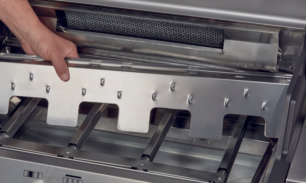 As tampas de chama em aço inoxidável protegem os queimadores e otimizam a distribuição do calor