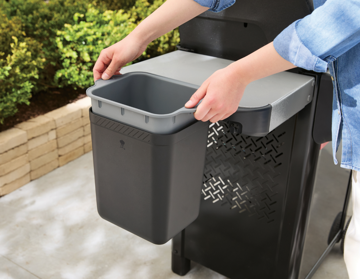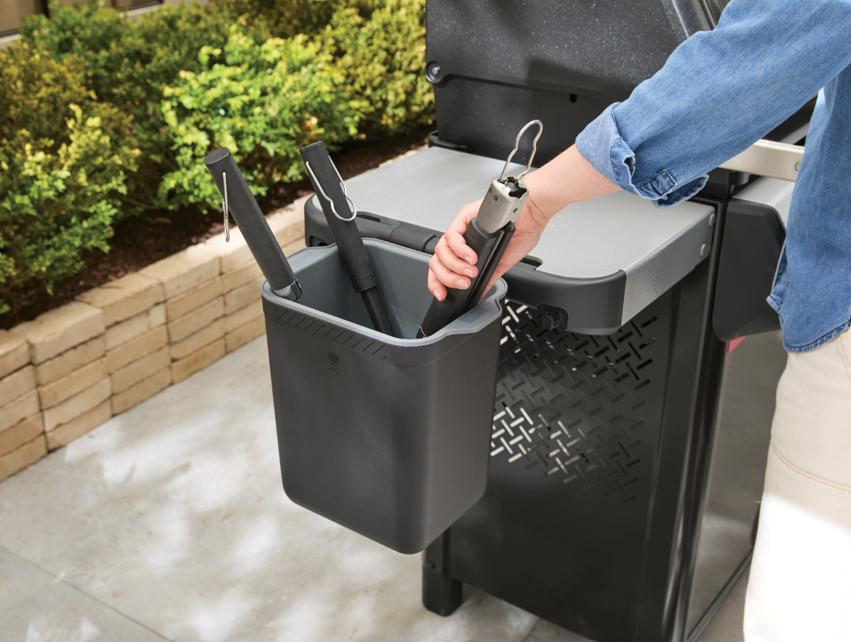 Weber Works. Basta encaixar o suporte numa calha lateral Weber Works para manter as mesas de apoio desimpedidas para preparar e servir. O fundo sólido do acessório evita que os molhos e óleo que escorrem dos utensílios caiam no seu espaço. Quando terminar de cozinhar, retire o acessório amovível e leve tudo para a cozinha para uma limpeza fácil e rápida. Compatível com modelos de grelhadores Weber® com uma calha lateral Weber Works.